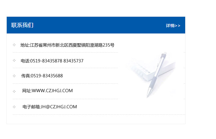 地址:常州市新北區友邦商務大廈1幢16、17層  電話:0519-85101652  傳真:0519-85112595  郵編:213022  網址:www.cz-jiayue_cn.14mao.com  郵箱:xiajifengaa@163.com